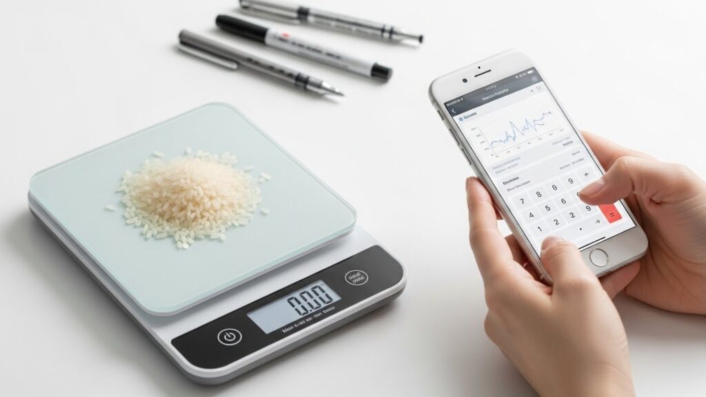 Balança alimentar: essencial para a CC avançada. Pesar os alimentos garante que as suas estimativas de porção estão corretas.